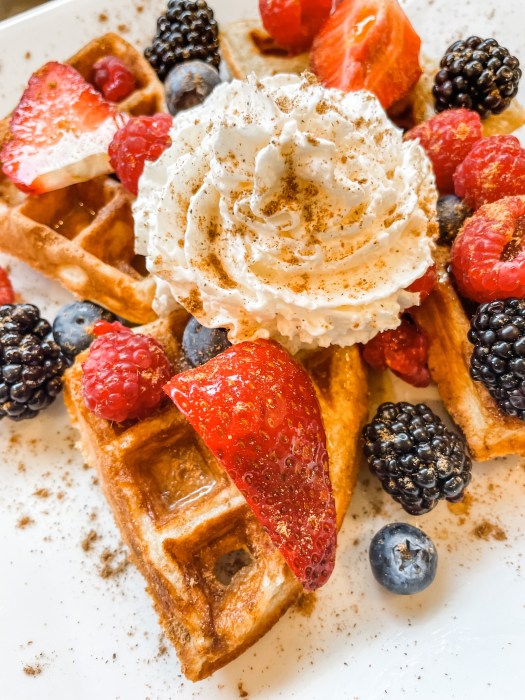 - Topping Suggestions: This is where it can get SUPER nutrient dense, creative and fun! Eat what is in season: fruit, nuts, dried fruit, jam, nut butter, spices/herbs or make your own berry sauces, whip cream or own creation! Perhaps Chicken & Waffles is more your style?! Or savoury Pancakes with Cheese & Herbs?