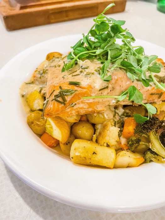 - I love to serve the bed of veggies all on the bottom of my plate, topping it with Salmon, Dill sauce and any extra herbs, sprouts or seasonings! I also add EXTRA sauce so that it drizzles down and soaks into all of the veggies (DROOL).