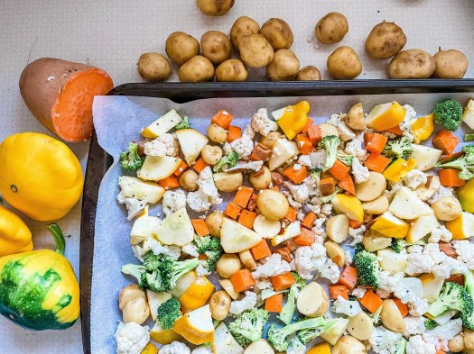 - While that is heating, grab your bowl of veggies from the fridge and spread out evenly on a baking tray or deep dish, lined with parchment paper. Ideally give them enough space so that they do not overlap on each other!
