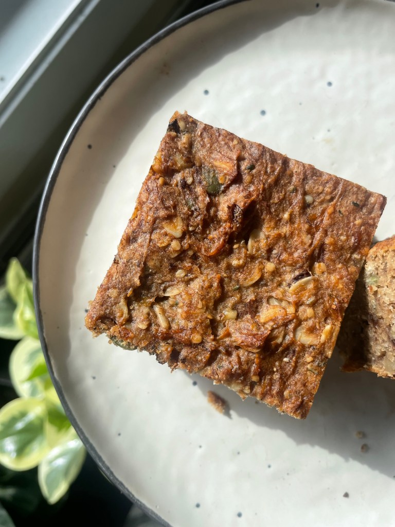 - Low sugar, high fat & protein: as mentioned above, the goal was to keep these TASTY but not overly sweet as we want to avoid any major insulin spikes first thing in the morning. When eating carbohydrates (whether they are simple or complex) we want to be pairing them with high quality fats & protein to help balance our blood sugar levels and keep us feeling satiated for longer. With these bars being loaded in fibre rich ingredients, nuts/seeds, nut butter, coconut oil & fatty mylk, we hit all the dietary marks!