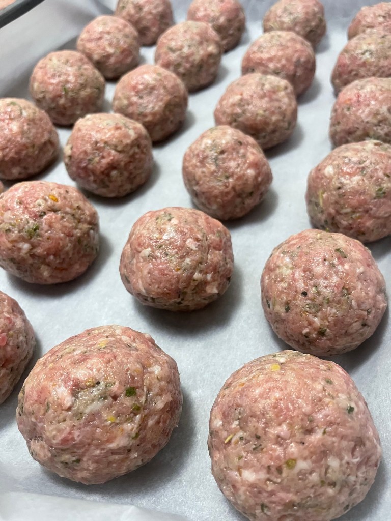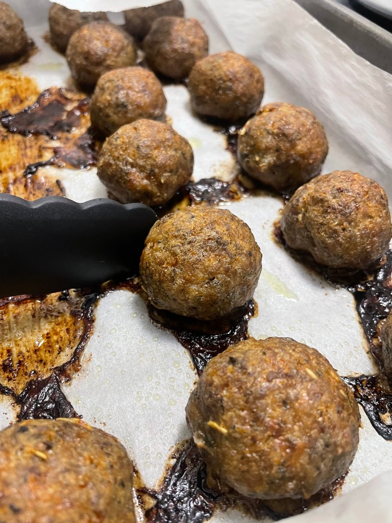 - When ready to use, bake or airfry from frozen or thaw in the fridge before using. To bake from frozen, place on a parchment lined baking sheet and bake in a preheated oven at 350°F for 45min or until internal temp reaches 165°F. If thawed, place on a parchment lined baking sheet and bake in a preheated oven at 350°F for 25-30min or until internal temp reaches 165°F. You could also cook thawed meatballs in a sauce either stove top or in oven, about 20-30min or until internal temp reaches 165°F. If using air fryer, place frozen meatballs in a preheated air fryer at 400°F, drizzle with olive oil and air fry for 10min or until internal temp reaches 165°F.