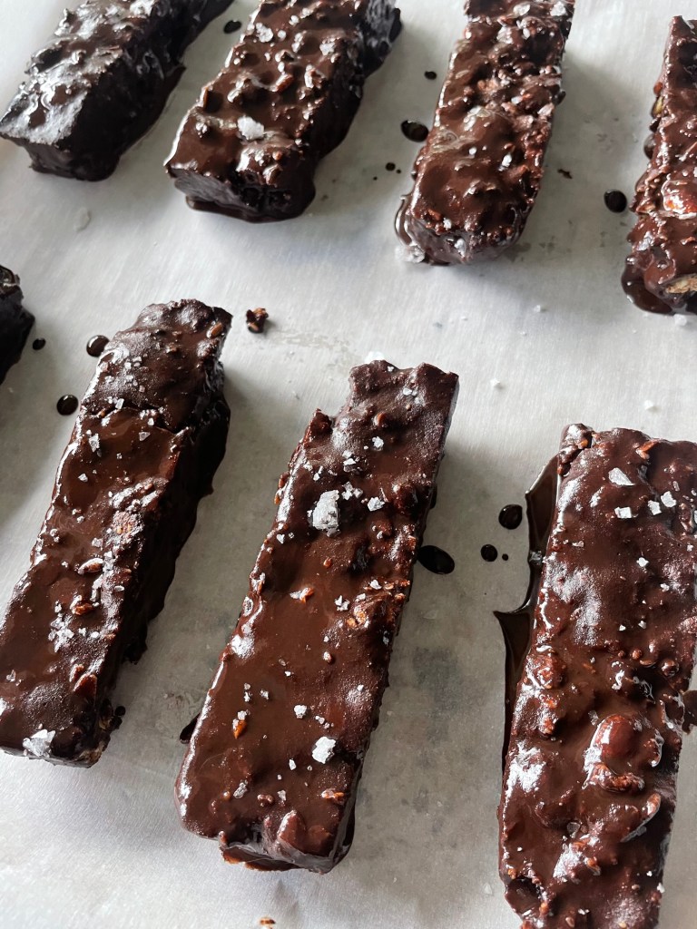 - When the bars are cold to touch, dip in the choocolate and lay on parchment lined baking sheets.