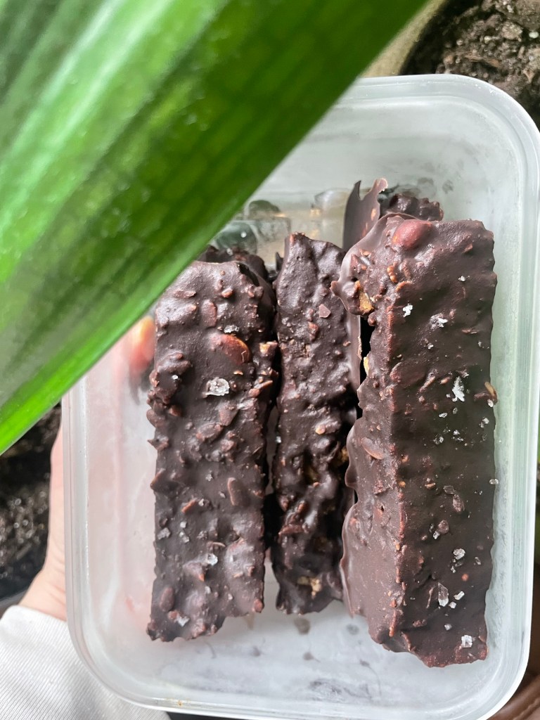 My goal truly was to replicate the chocolate dipped granola bars you can buy at grocery stores so I was genuinely happy with how they turned out! And luckily their consistency stays good even at room temperature so they’ve been a great snack to bring golfing, walking or sit with me while breastfeeding!!